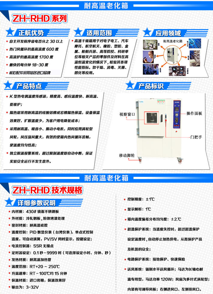 用于對電子電工、汽車摩托、航空航天、橡膠、塑膠、金屬、船舶兵器、高等院校、科研單位等相關(guān)產(chǎn)品的零部件及材料在高溫恒溫變化的情況下,檢驗其各項性能指標(biāo)。嚴(yán)格按GB/T2423.2-2008高溫老化試驗方法制造。